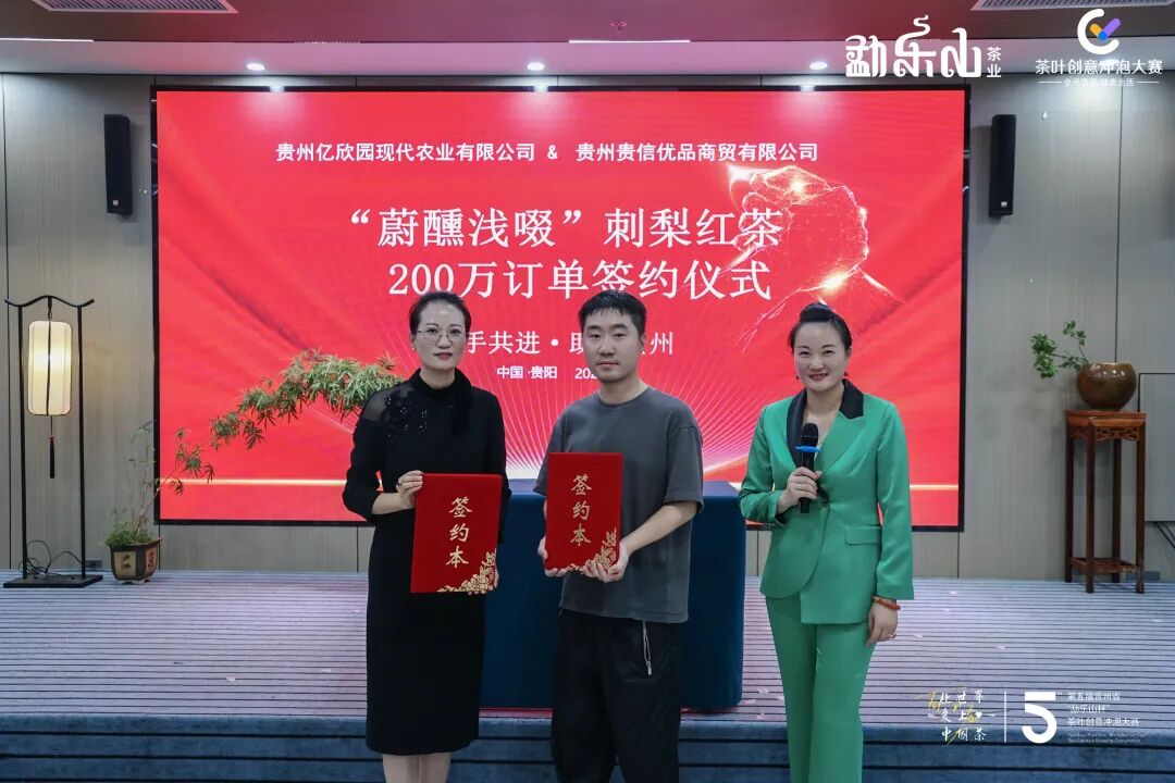 刺梨,贵州特色水果,在此次大赛中成为新茶饮的“风味担当”。在湄潭国际交流活动中,阿尔巴尼亚青年Sindi现场制作的刺梨柠檬茶令人惊喜赞叹,此次活动进一步推动了刺梨与红茶的融合,开发出多款“茶咖奶梨”组合配方。“蔚醺浅啜”刺梨红茶以其独特口感和丰富营养价值,在大赛中广受关注,还成功打入国际市场,在2025香港国际茶展上获奖,吸引了众多国际买家驻足,一位德国客商称赞其“果香茶韵,浑然天成”。贵州亿欣园现代农业有限公司在大赛期间分别与贵州贵信优品商贸有限公司、贵州黔鹿升商贸有限公司、贵阳呈吉茶业、海南政慧供应链管理有限公司举行“蔚醺浅啜”品牌刺梨红茶签约仪式,共计800万的产业订单,体现了市场对刺梨红茶的认可,为产业发展提供了有力支撑。