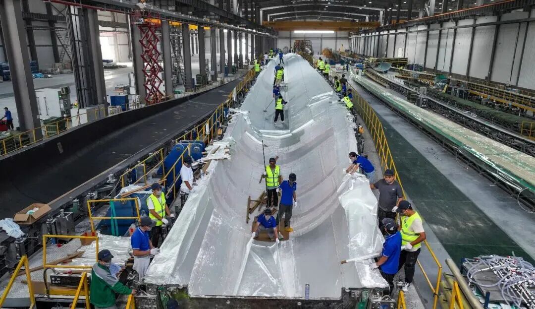在上海电气贵州龙里产业园工人正在生产风机叶片