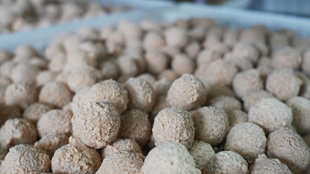 该公司生管部经理尹亚敏向记者介绍:“充分浸泡过的黄豆经过磨浆、煮浆、点卤、压制、油炸等工艺后,一小时左右便可成为外焦里嫩的豆腐圆子 。”